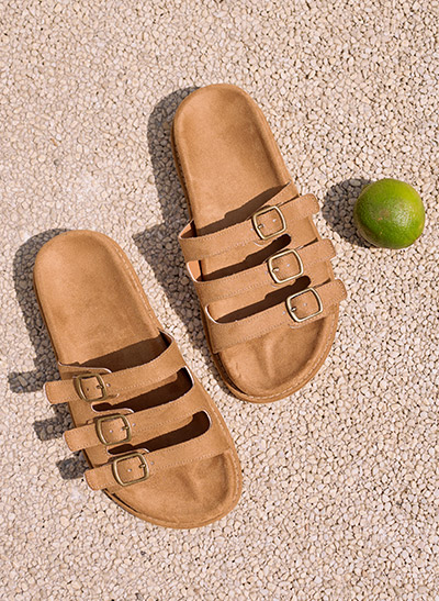 살짝 무게감이 느껴지는 버클 스트랩 슬리퍼에요! 스웨이드 소재감으로 발을 부드럽게 잡아주고, 안정감이 느껴지구요 여름에 멋스럽게 신기 좋은 슈즈랍니다~ - 63,800원