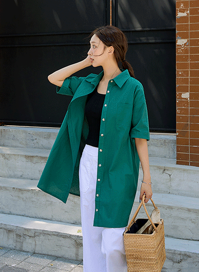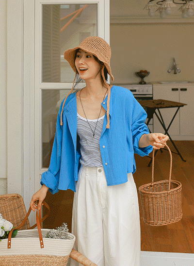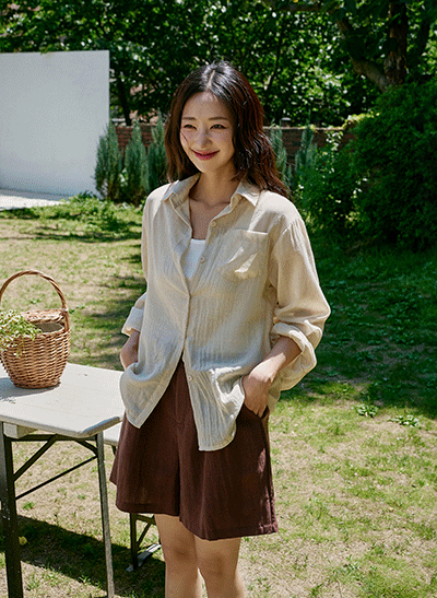 비침이 느껴지는 얇은 요루 원단으로 한여름에도 시원하게 착용되는 셔츠구요~ 자잘한 링클 텍스처로 소재만으로도 포인트주기 좋으며, 선명한 색감이 예쁘게 피부를 밝혀준답니다 - 41,800원