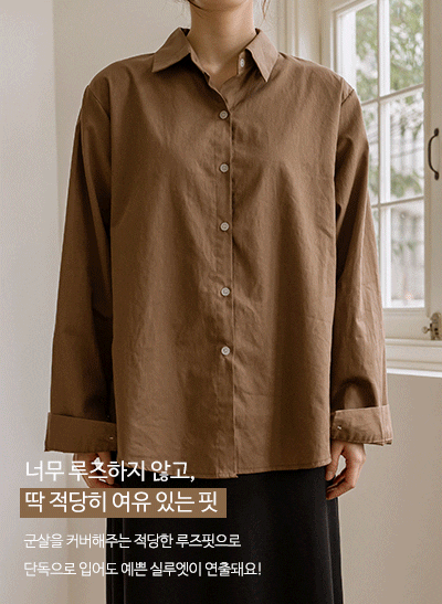 매일 입기 좋은 베이직한 긴팔 셔츠를 소개해드릴게요! 루즈한 핏감으로 군살을 커버해주어 단독으로 입어도 좋고, 니트나 맨투맨 안에 레이어드해도 좋아 활용도 good! -