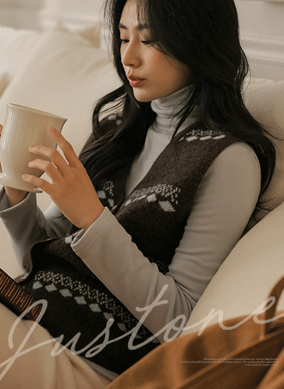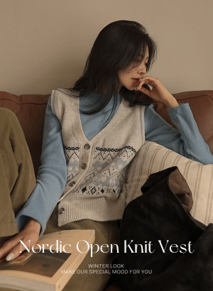 빈티지한 감성이 느껴지는 노르딕 패턴이 포인트로 낙낙한 품과 브이넥 디자인이 매력적인 조끼 가디건이에요! -