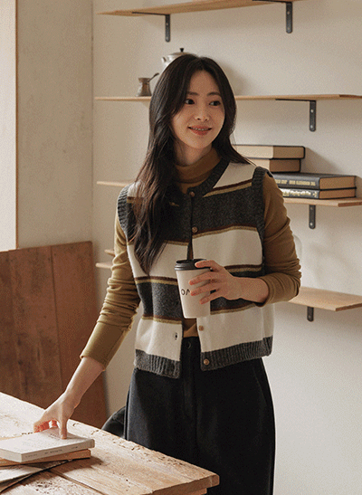 버튼을 모두 잠가서 터틀넥으로 연출할 수 있는 니트 조끼에요, 넉넉한 품으로 체형을 커버해주어 기본 티셔츠 위에 툭 입기 좋아요 -
