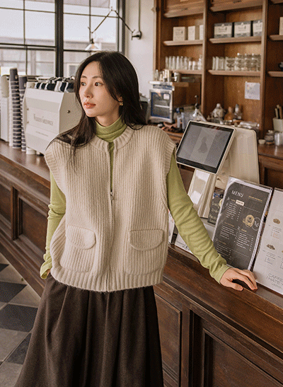 - 5DA32064HN_엘보 하이넥 니트 집업조끼