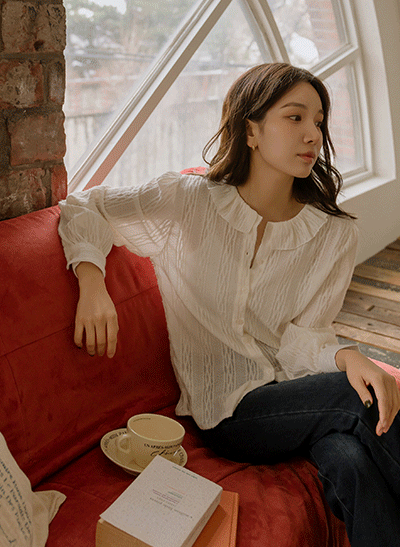 꽃잎 같은 프릴넥으로 얼굴 빛이 한-톤 살아나는 효과가 느껴지는 블라우스! 은은하게 비침이 있는 원단으로 여리여리하며, 포인트 이너로 레이어링하기 좋구요~ 거기에 겉기모로 따뜻함까지 채워줬답니다 - 30,800원