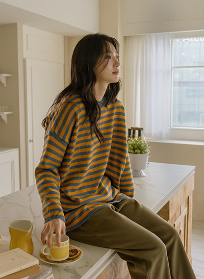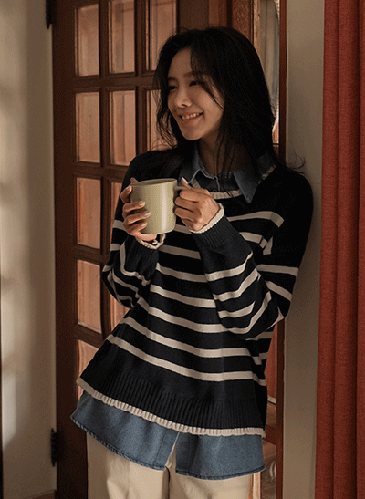 잔잔한 스트라이프가 매력적으로 다가오며, 넥라인에 단정한 배색으로 깔끔한 니트구요 포근한 니트에 넉넉한 품이 군살을 커버해주어 데일리로 입기 좋아요 - 28,500원