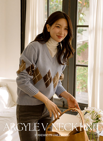 아가일 패턴으로 클래식한 무드를 자아내고, 브이넥 디자인이라 셔츠와 함께 레이어드해도 좋은 아이템이에요! 울이 혼방되어 따듯하게 입기 좋답니다 -