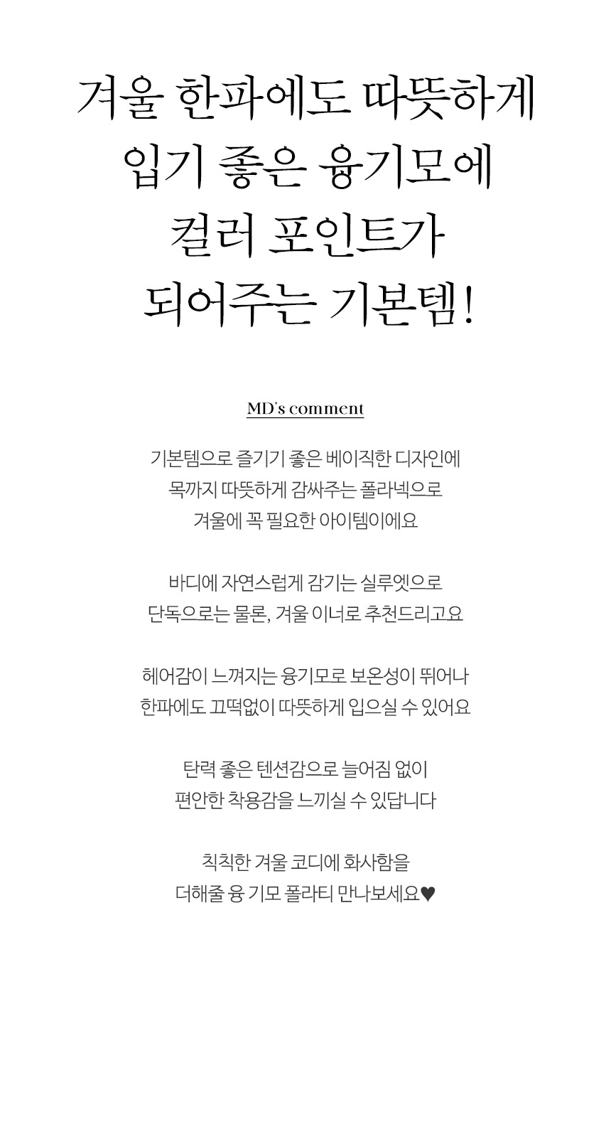 한겨울 한파에도 따뜻하게 입기 좋은 융기모 안감에 화사한 컬러 포인트로 겨울에도 스타일링 하기 좋은 베이직템!