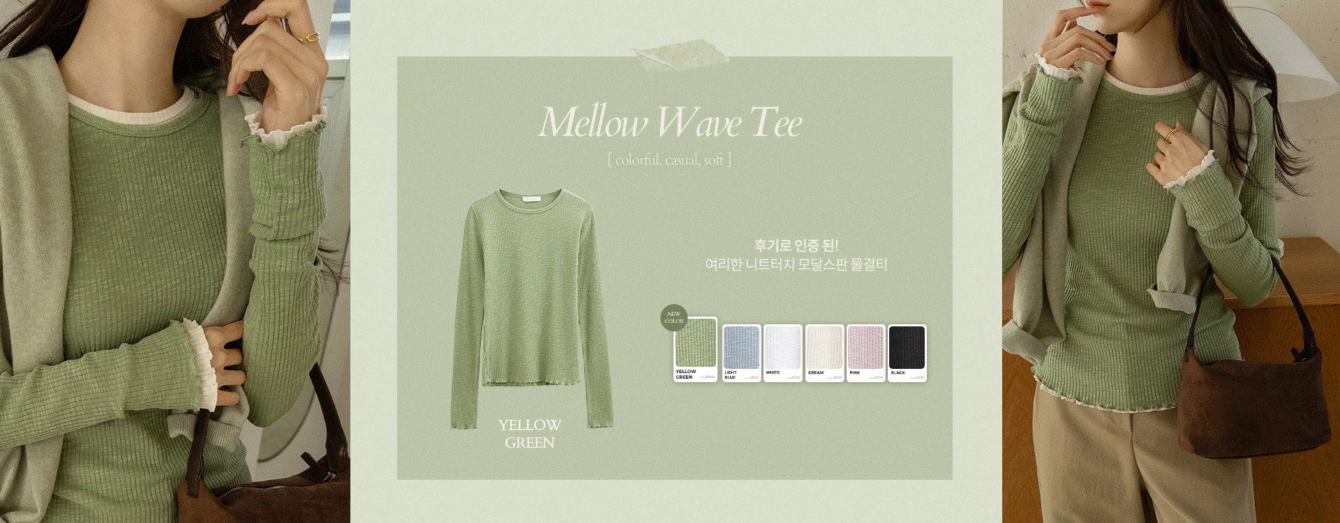 은은하게 번지는 러블리함, 니트터치 모달스판 물결티! 이번에 싱그러운 연두 컬러가 추가되었구요♥ 잔골지 원단이 바디를 슬림하게 잡아주고, 끝단 물결이 포인트라 레이어드하기 좋은 아이템이에요~