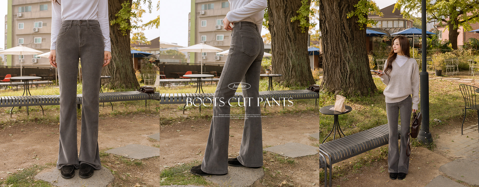 허벅지 라인은 살리고, 종아리는 숨기고! 다리 라인이 전체적으로 예뻐지는 부츠컷 핏의 팬츠구요~ 인밴딩과 신축성으로 24시간 편안하게 착용되며, 기모가 깔린 골덴 원단으로 따뜻함까지 채워줬어요♥