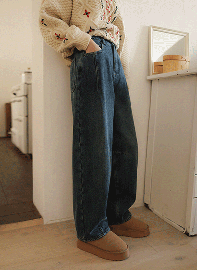 옆선 절개 라인이 살짝 앞쪽으로 오면서 와이드 핏임에도 밋밋함이 없어 보이고~ 시각적으로도 다리 라인이 길고 슬림해 보이며, 거기에 융기모로 보온성을 극대화한 겨울 데님 팬츠예요! -