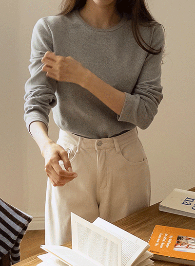 내추럴한 반목 티셔츠로 목을 조이지 않아 편안하게 착용 가능하구요, 안쪽에 부드러운 속기모로 f/w에 이너로 입기 좋은 아이템이에요 -