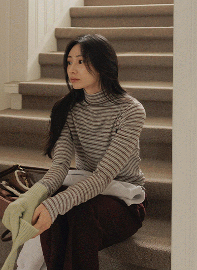 보송보송한 겉기모로 추운 겨울을 따뜻하게 보낼 수 있는 반목 티셔츠! 세련된 컬러감의 스트라이프 패턴이 포인트가 되어주며, 유연한 스판기로 바디에 편안하게 감겨요~ -