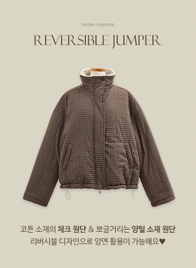 한쪽 면은 매끈하는 체크 원단, 또다른 한쪽 면은 양털 소재감의 원단으로 된 리버시블 디자인의 점퍼로 내 마음대로 코디할 수 있구요~ 상체를 넉넉하게 감싸주어 누구나 편안하게 입기 좋아요! -