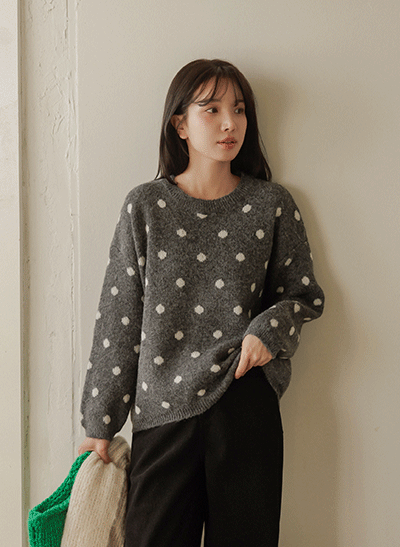 과하지 않은 도트 패턴으로 귀여운 매력이 느껴지는 니트구요~ 겨울 시즌에 따뜻하게 입을 수 있도록 울 소재가 혼방되었답니다! 다가오는 연말에 사랑스러운 포인트로 입어보세요:) -