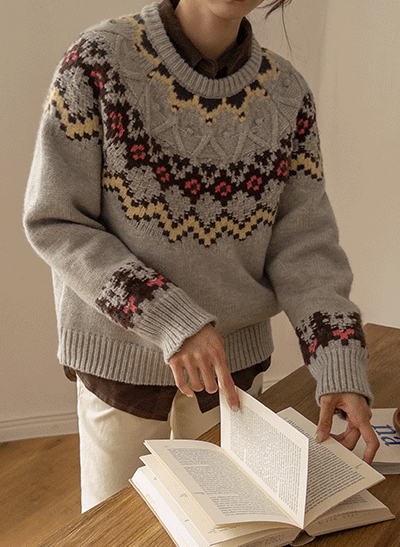 세련된 컬러 배색이 돋보이는 노르딕 패턴의 겨울 니트! 나그랑 소매로 내추럴하게 흐르는 핏감이 예쁘구요~ 도톰한 두께라 하나만 입어도 든든해요 -