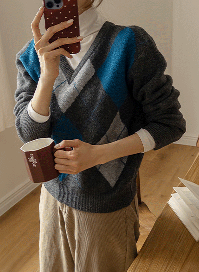 깔끔하고 모던한 무드의 아가일 패턴으로 데일리는 물론, 출근룩으로 입어도 좋구요 군살을 적당히 커버해주는 여유핏이라 편하게 입어진답니다 -