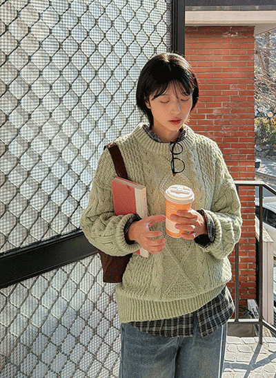 뽀송~뽀송 꽈배기 텍스처로 포근하게 입기 좋은 라운드 니트구요, 루즈한 핏으로 체형을 커버해주고 컬러감이 예쁜 아이템이에요 -