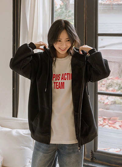이렇게 도톰하고 따듯한 융기모가 가득~ 깔린 후드집업으로 아우터처럼 입어도 좋은 아이템이에요! 게다가 루즈한 핏이 군살을 커버해주어 휘뚜루 마뚜루 편하게 착용하기 좋아요 -