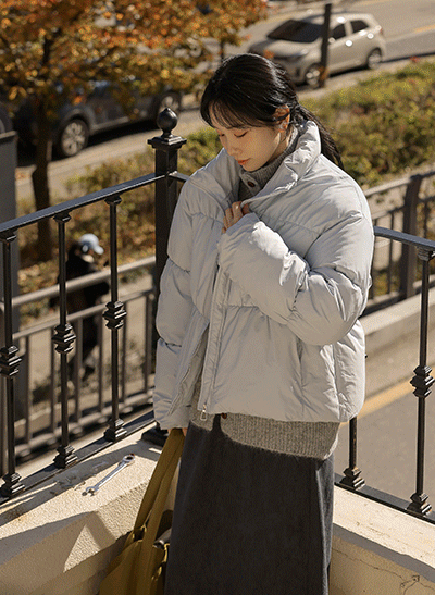 웰론패딩으로 가볍고 따듯하게 입는 아우터에요! 파스텔처럼 예쁜 컬러감이 매력적이구요, 넉넉한 품과 세미 크롭 기장감으로 귀여워요! -