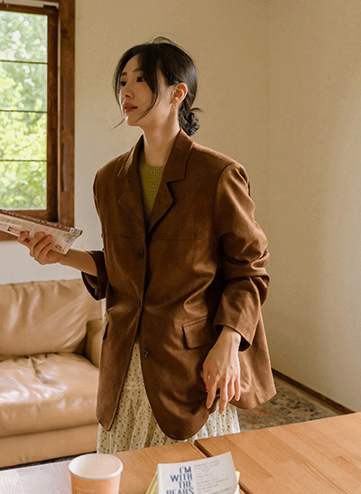 가을 분위기가 물씬 느껴지는 스웨이드 자켓! 힙 라인을 가려주는 하프 길이로 부담 없이 든든하게 입기 좋으며, 세미 오버핏으로 가볍게 걸치기만 해도 트렌디한 스타일링이 연출돼요~