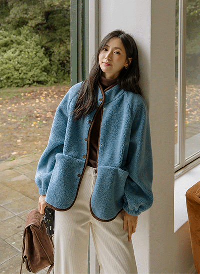 따뜻하고 부드러운 뽀글이 양털 소재감으로 귀여움이 느껴지는 아우터구요~ 바이어스 테잎 라인 배색이 세련된 포인트가 되어줘요! 야외 활동할 때 입기 좋은 캐주얼한 아우터로 추천해 드려요♥
