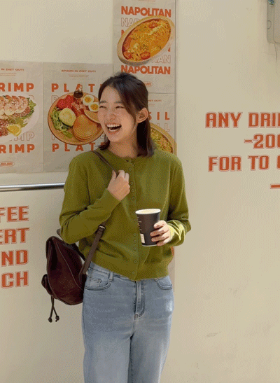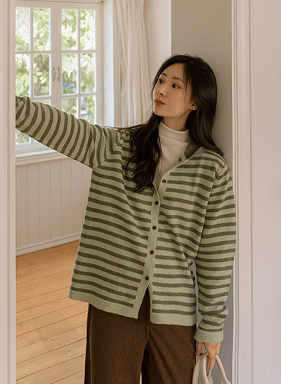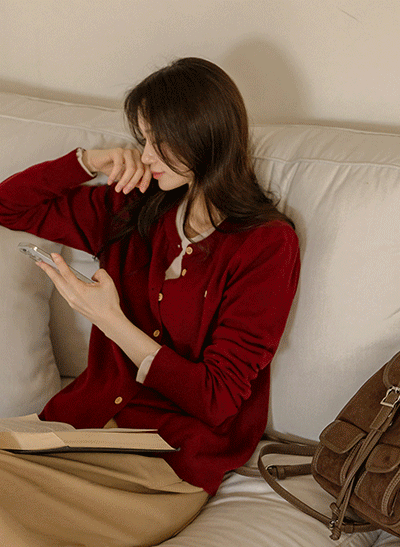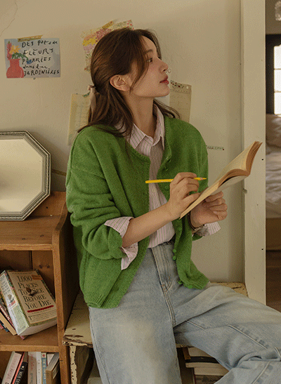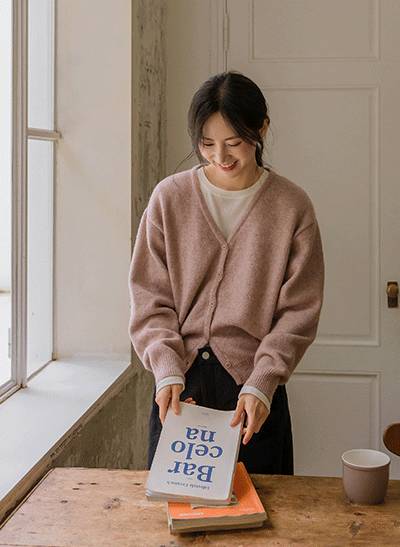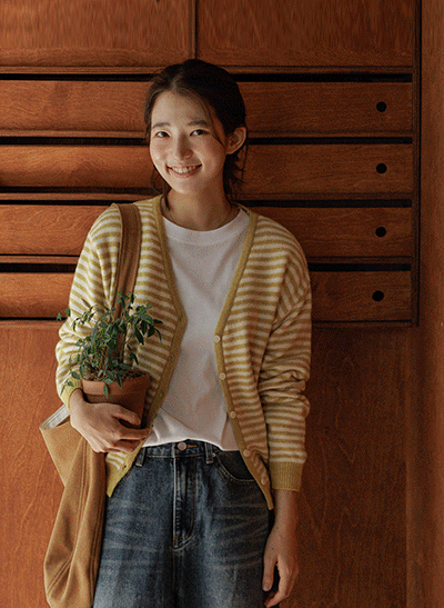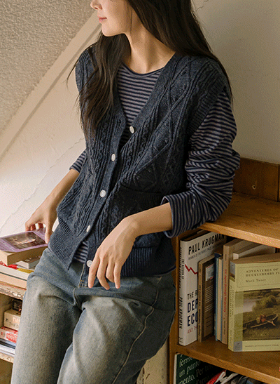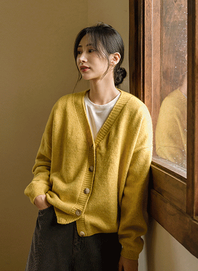브이넥으로 트여진 작은 네크라인 가디건으로 은근 여성스러운 포인트가 되어주고, 골지 짜임으로 슬림해 보여 여리여리한 무드를 자아내는 가디건이에요 버튼을 모두 잠가서 니트처럼 입어도 좋아요