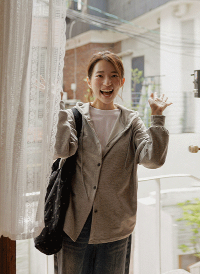 어깨가 부각되지 않는 래글런 후드 가디건에 포근한 터치로 따듯하게 입기 좋구요, 후드 디자인으로 귀여운 무드를 자아내요! 데일리로 집 근처에 나갔을 때 입어도 좋은 이지템이에요