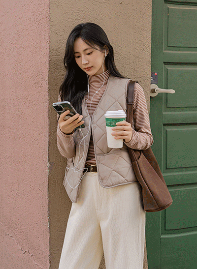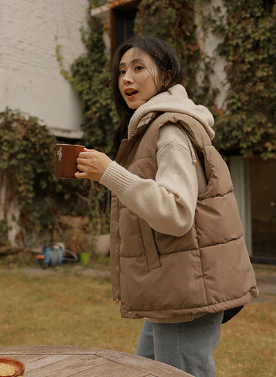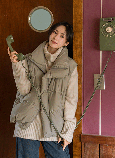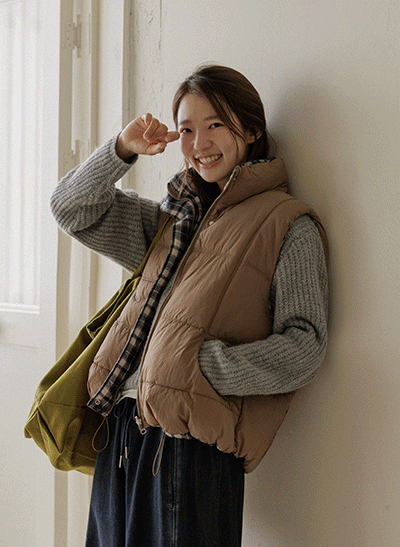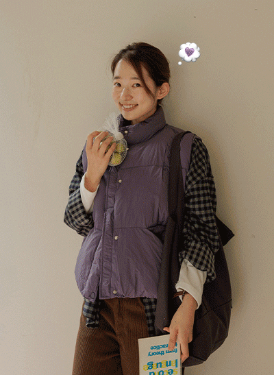 폭신한 터치가 느껴지는 패딩조끼로 캐주얼하게! 하이넥 디자인으로 찬바람을 막아주고, 낙낙한 핏이 군살을 커버해주어 이번 겨울에 휘뚜루 마뚜루 편안하게 입기 좋은 아이템이랍니다~