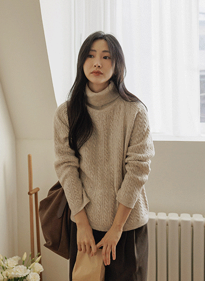 입체적인 꽈배기 짜임으로 데일리하게 입기 좋구요, 고급스러우면서 보온성이 뛰어난 램스울이 50% 혼방되어 하나만 입어도 따듯한 폴라 니트에요 -