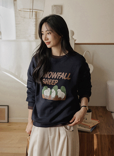 추위를 든든하게 막아주는 속기모로 따뜻하게 입기 좋은 맨투맨이구요~ 컬러 배색감이 돋보이는 양 프린팅이 귀여우면서도 캐주얼한 포인트가 되어줘요! -