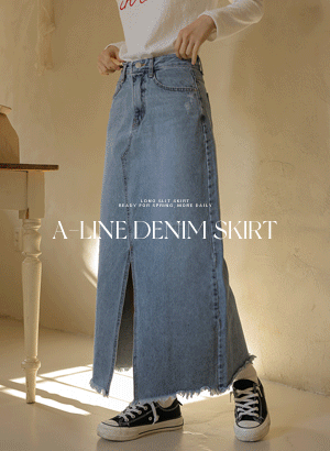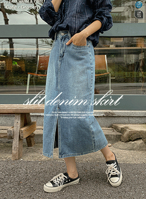 H라인 실루엣에 밑단 슬릿디테일로 편안한 활동성과 여성스러운 무드가 느껴지는 데님스커트로 멋스러운 스타일링을 완성해보세요! - 30,800원