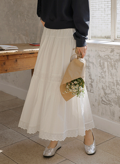 러블리한 레이스 밴딩스커트로 봄날에 사랑스럽게 입기 좋구요, 허리가 편안한 올밴딩에 롱한 기장감이 군살을 싹 커버해줘요! - 26,800원