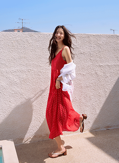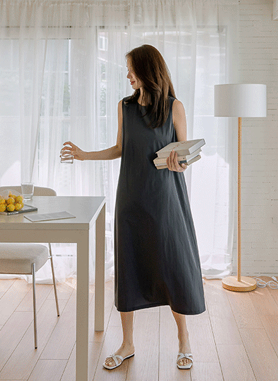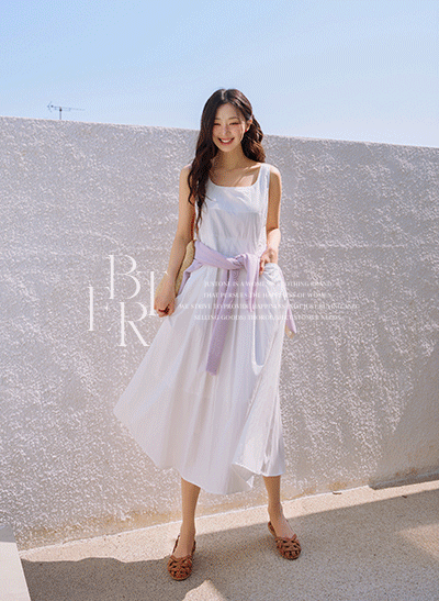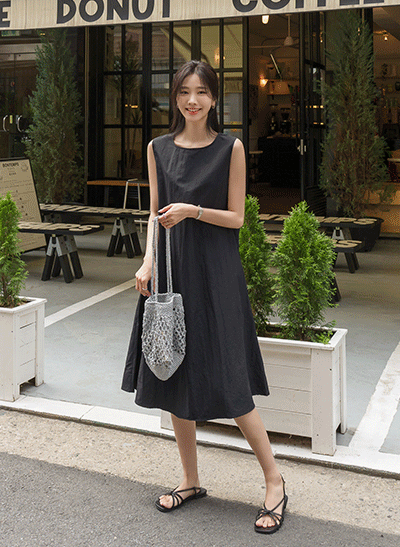바스락한 터치로 바디에 잘 달라붙지 않는 시원한 소재! 베이직한 나시 원피스에 플레어처럼 퍼지는 핏으로 군살을 커버해줘요 -