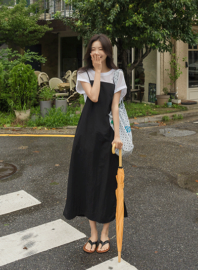 어깨 스트링으로 길이 조절이 가능하고, 다양한 상의와 레이어링하기 좋은 끈원피스! 바스락거리는 가벼운 원단으로 몸에 감기지 않으며, 여유있게 떨어지는 일자핏으로 편안하게 입어져요~ - 39,500원