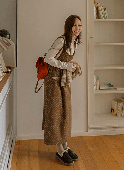 귀여운 멜빵원피스를 소개해드릴게요~ 부드러운 골덴 소재로 따듯하고, 잔잔한 플라워 패턴으로 러블리한 무드까지! 롱한 기장감으로 체형을 커버해주어 f/w에 입기 좋은 원피스에요 -