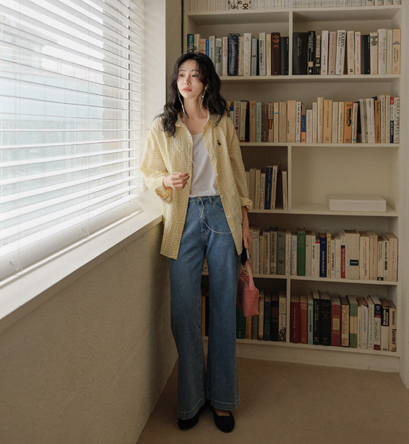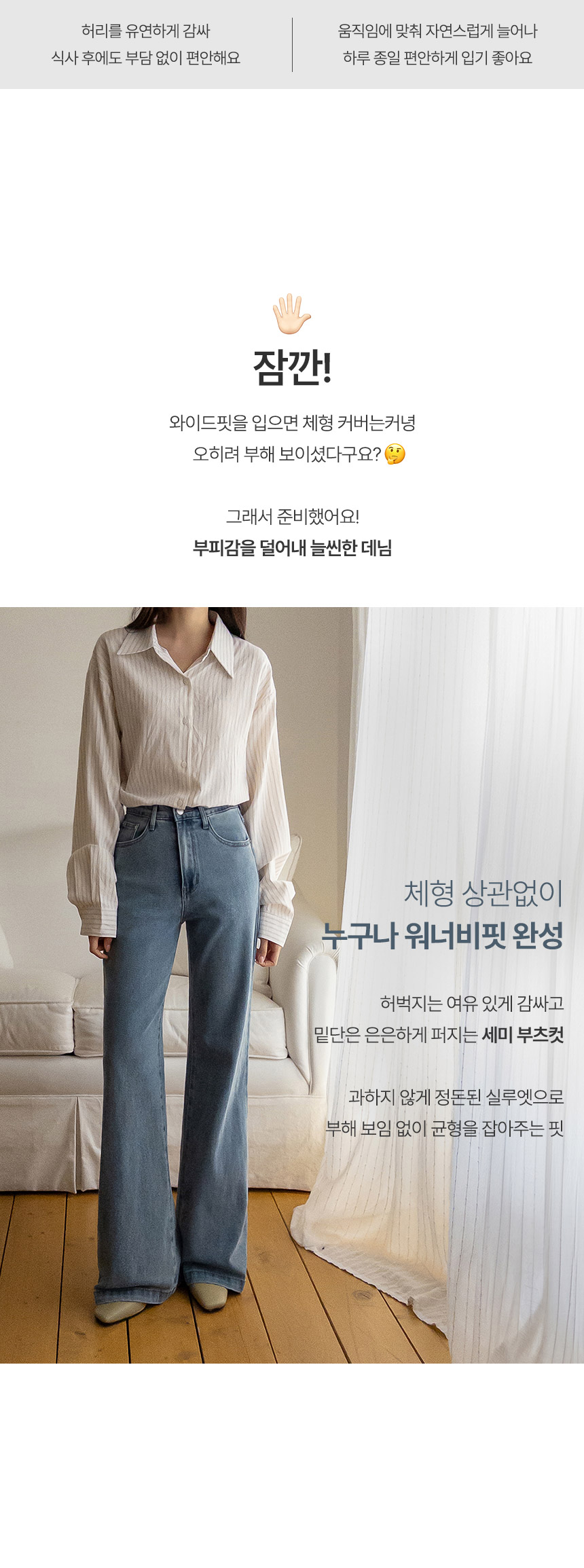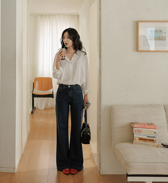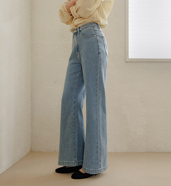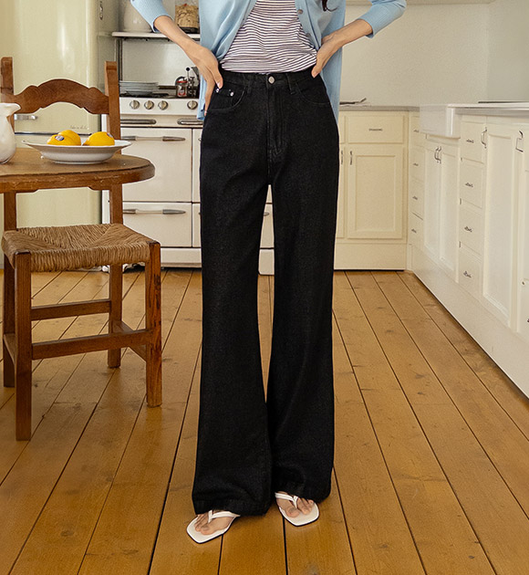 가볍고 살랑이는 리오셀 소재로 편안하게 입기 좋은 데님이구요, 여유가 느껴지는 와이드에 밑단만 살짝 퍼지는 부츠컷으로 누구나 부담없이 입기 좋은 아이템이에요!