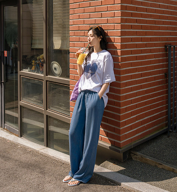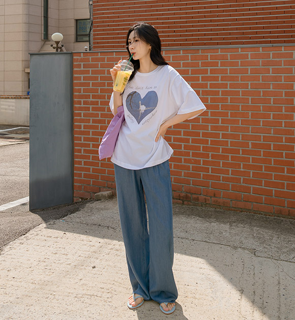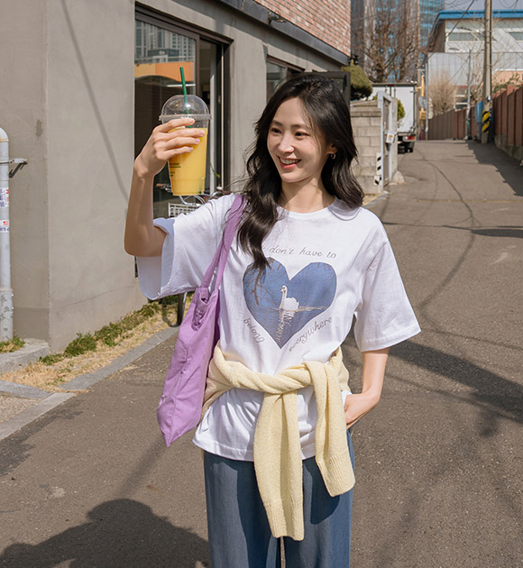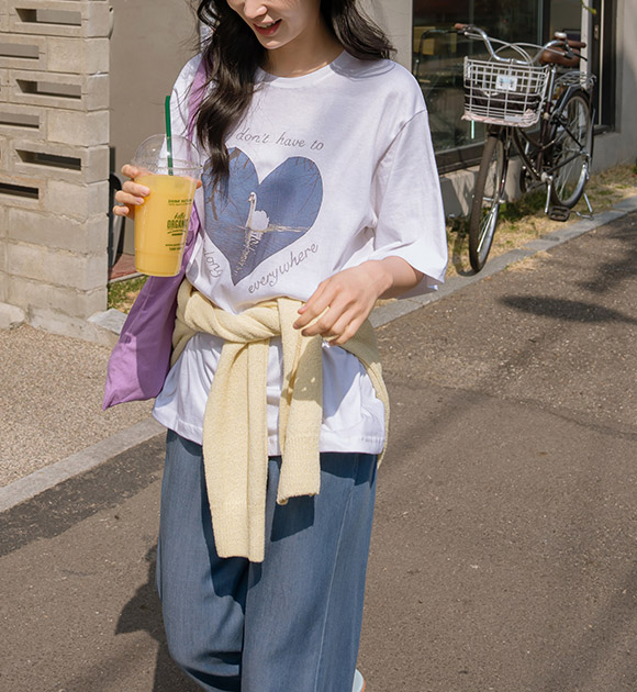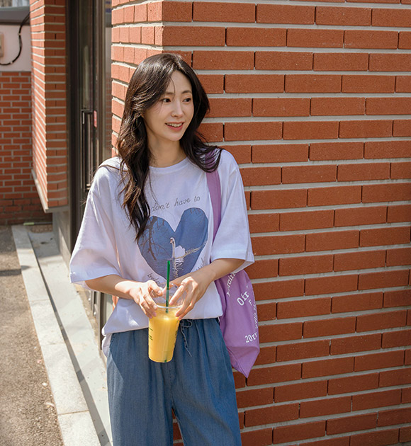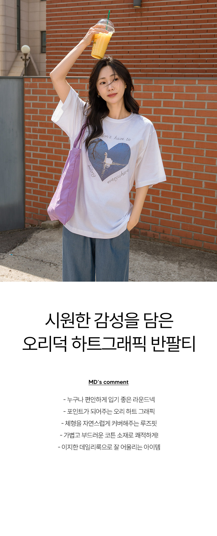 루즈한 핏감으로 체형을 자연스럽게 커버해주고 하트 그래픽이 포인트가 되어주는 아이템으로 청바지와 함께 코디하기 좋은 반팔티랍니다