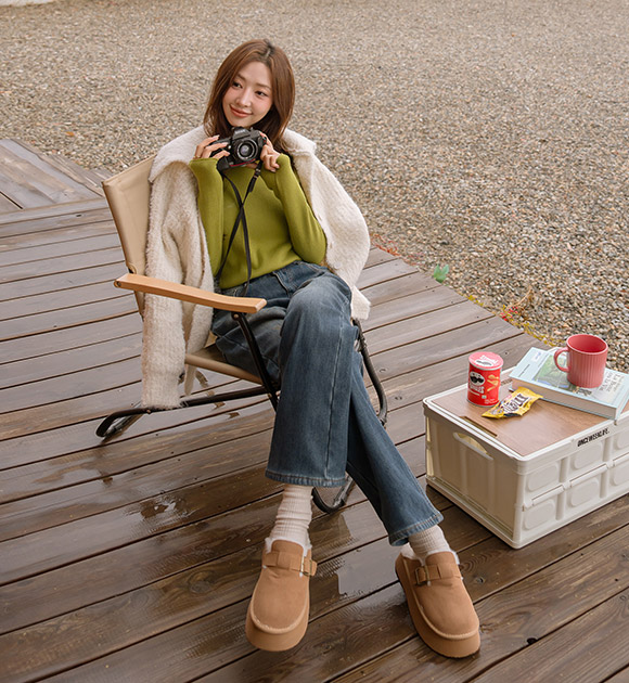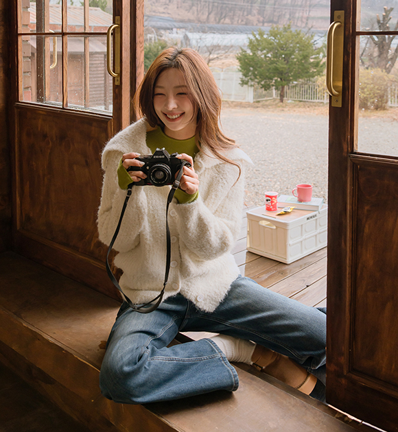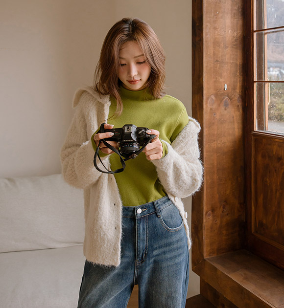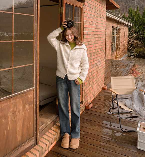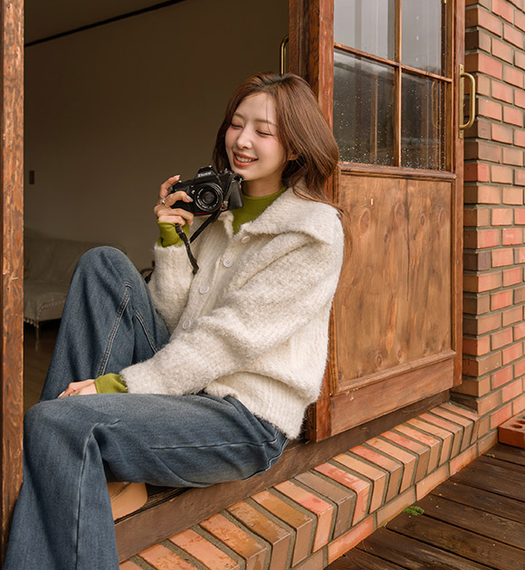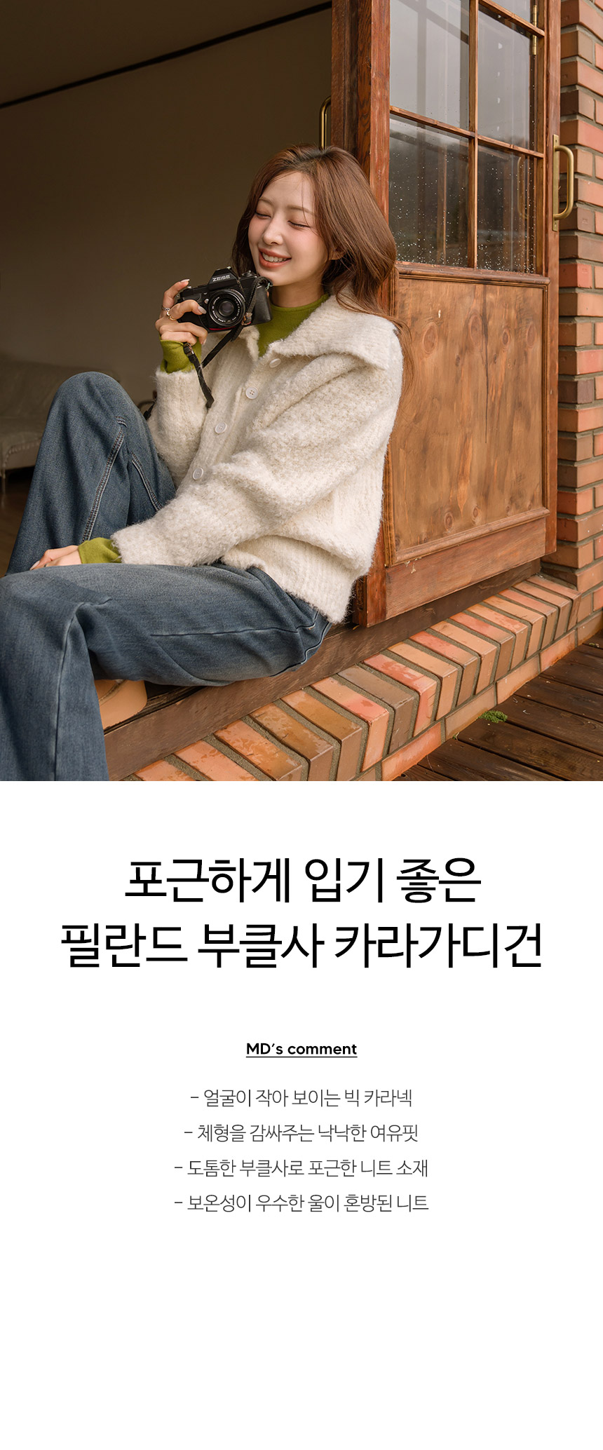 와이드한 카라넥으로 귀여운 무드를 더해주고 도톰하고 포근한 부클사 니트로 겨울에 따듯하게 입기 좋안 카라넥 가디건이에요!