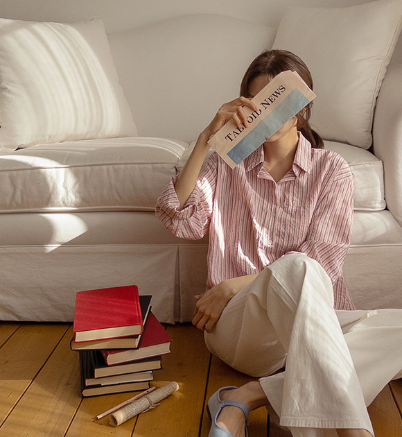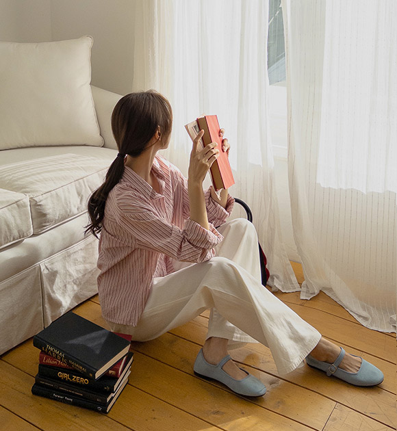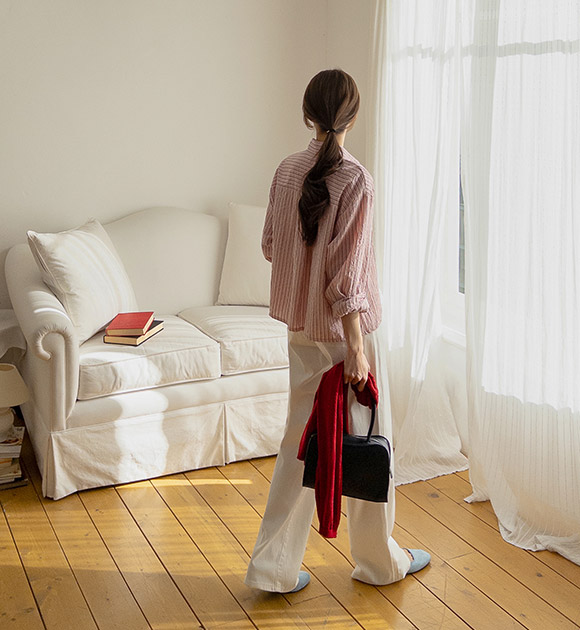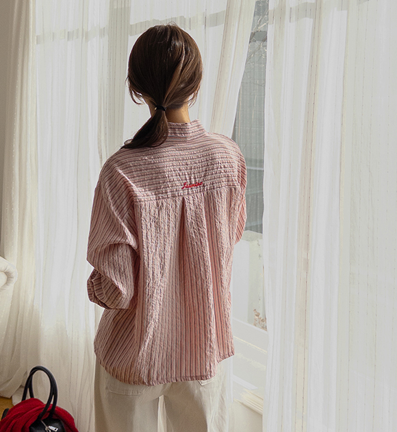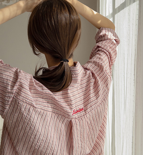 뒷부분에 자수 포인트로 머리를 묶어도 예쁜 줄지 셔츠에요! 세미 크롭 기장감으로 다리가 길어 보이고, 세로 줄지로 슬림해 보이는 효과까지 더해준답니다