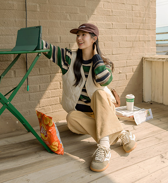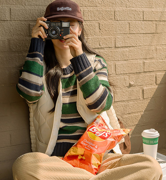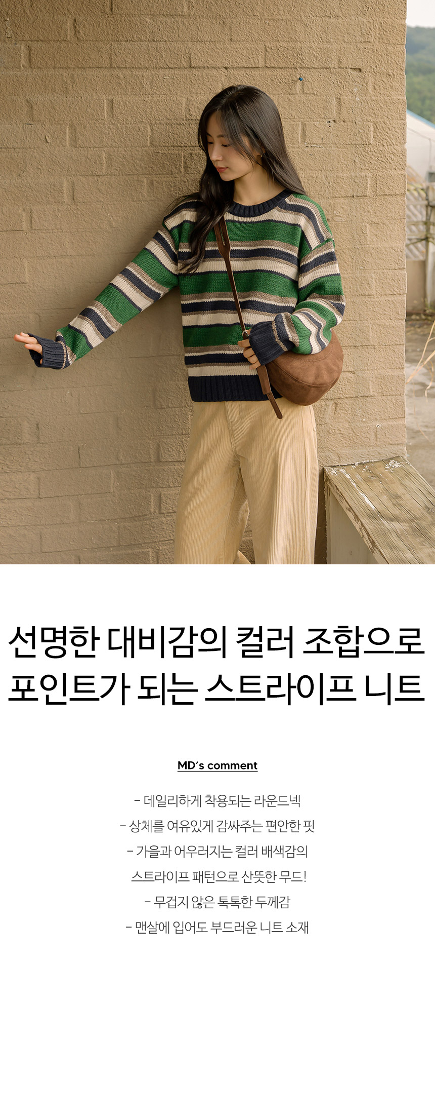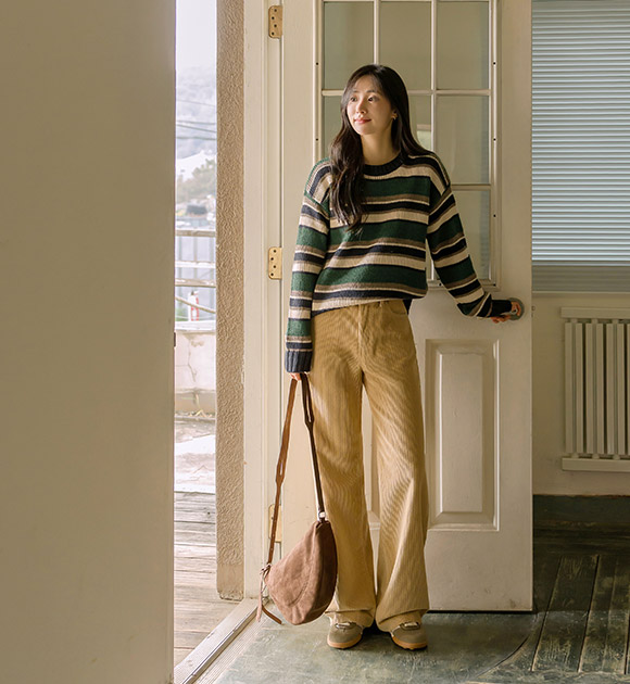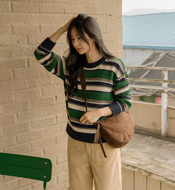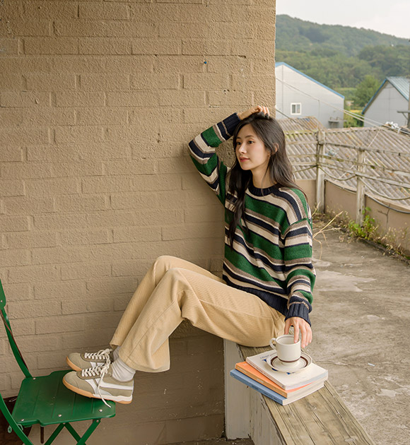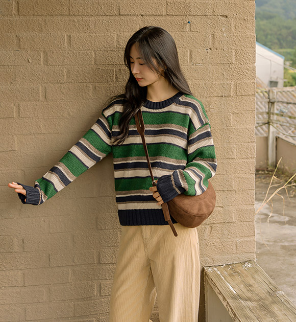 선명한 대비감의 컬러 조합으로 포인트가 되는 스트라이프 니트구요~ 상체를 편안하게 감싸주는 여유핏으로 누구나 부담 없이 입기 좋은 산뜻한 데일리 니트로 추천해 드려요!