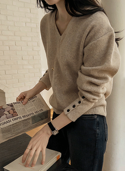 베이직한 기본 브이넥 니트에 소매단추로 디테일로 은은한 포인트를준 아이템이에요 깔끔한 스타일이라 데님,슬랙스 등 다양한 하의와 매치하기 좋아서 소장하시면 좋으실꺼에요! -