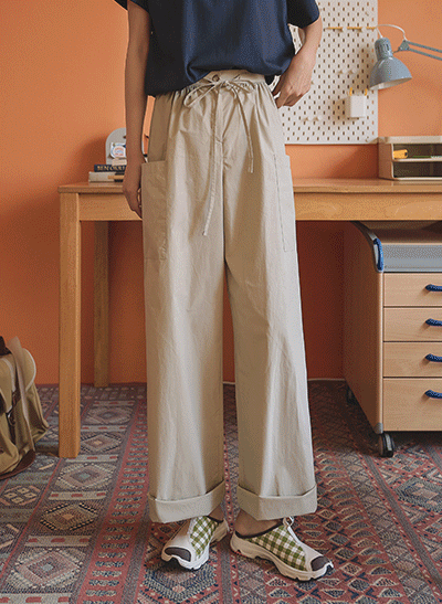 다양한 스타일링에 코디하기 좋은 코튼 팬츠에요 허리에 스트링이 내장되어 체형에 맞게 사이즈 조절해서 입으실 수 있구요 롱한 실루엣으로 롤업으로 연출해서 입으셔도 좋은 아이템입니다:)