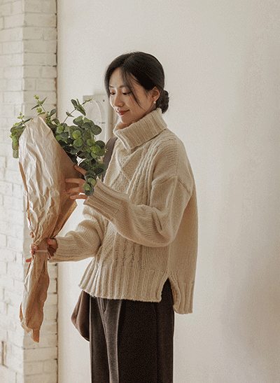 폴라넥부터 몸판까지 전체적으로 여유있는 둘레 사이즈로 편안하게 착용되는 니트구요~ 입체적인 피셔 짜임과 언발란스한 옆트임으로 니트 하나만 입어도 멋스러움이 가득 느껴진답니다! -