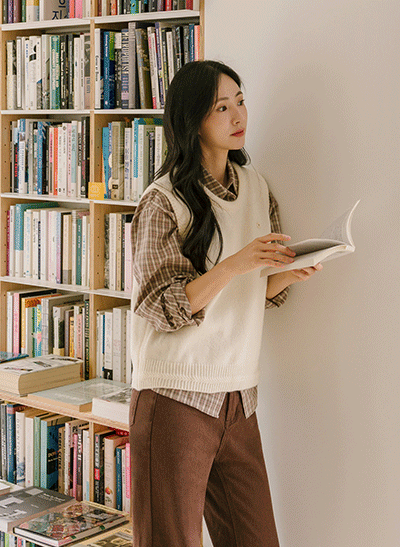 입체적인 짜임만으로도 멋스러운 니트 조끼로 상의 하나만 입기 심심할 때, 가볍게 레이어링해주면 스타일이 더욱 살아나요! -