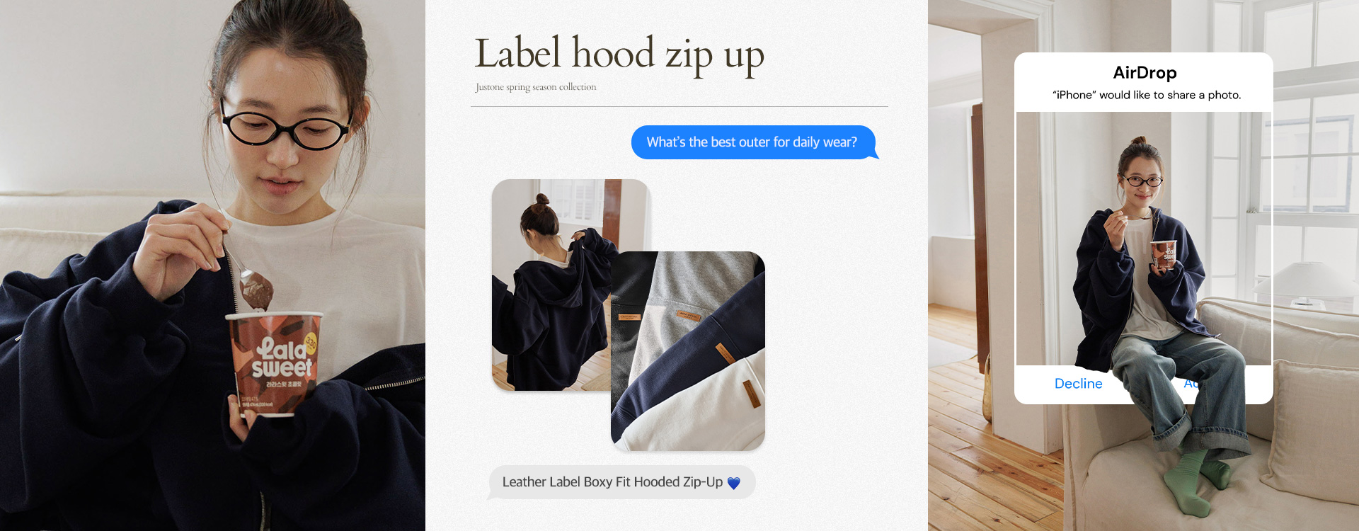 캐주얼한 무드의 후드집업 디자인에 저스트원 시그니처 자수 디테일이 더해져
