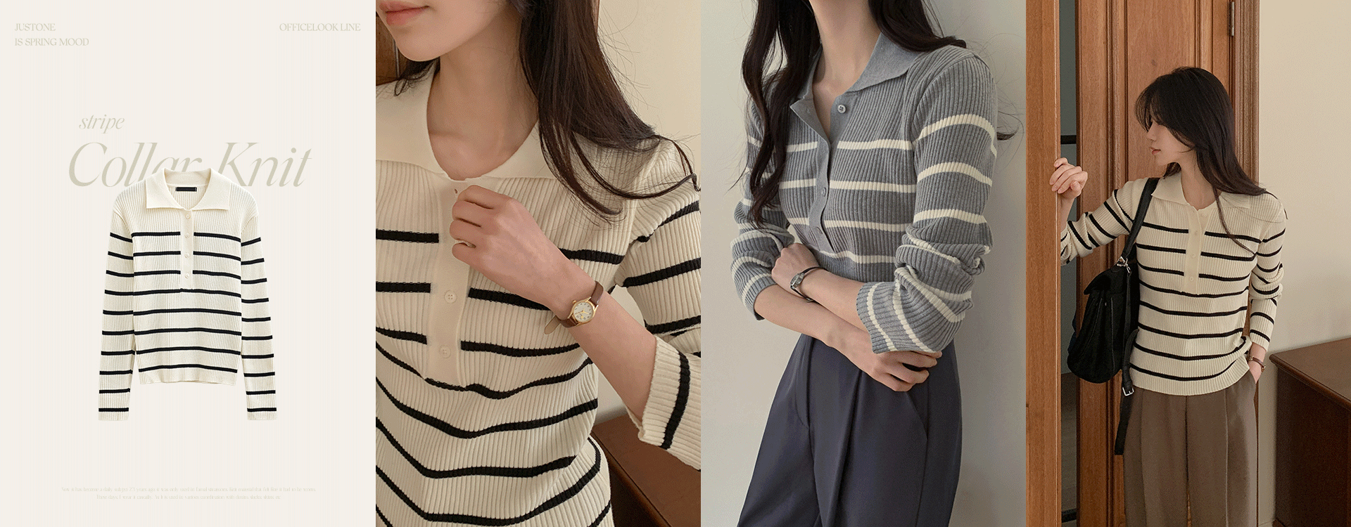 캐주얼한 무드가 느껴지는 카라넥 배색 줄지 니트구요,