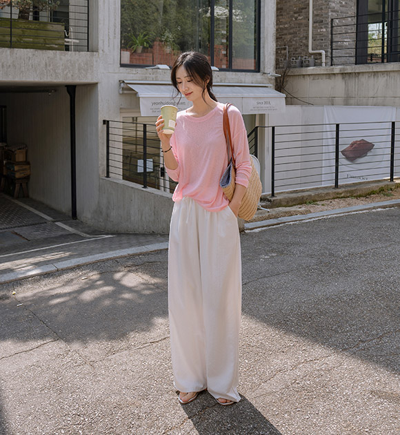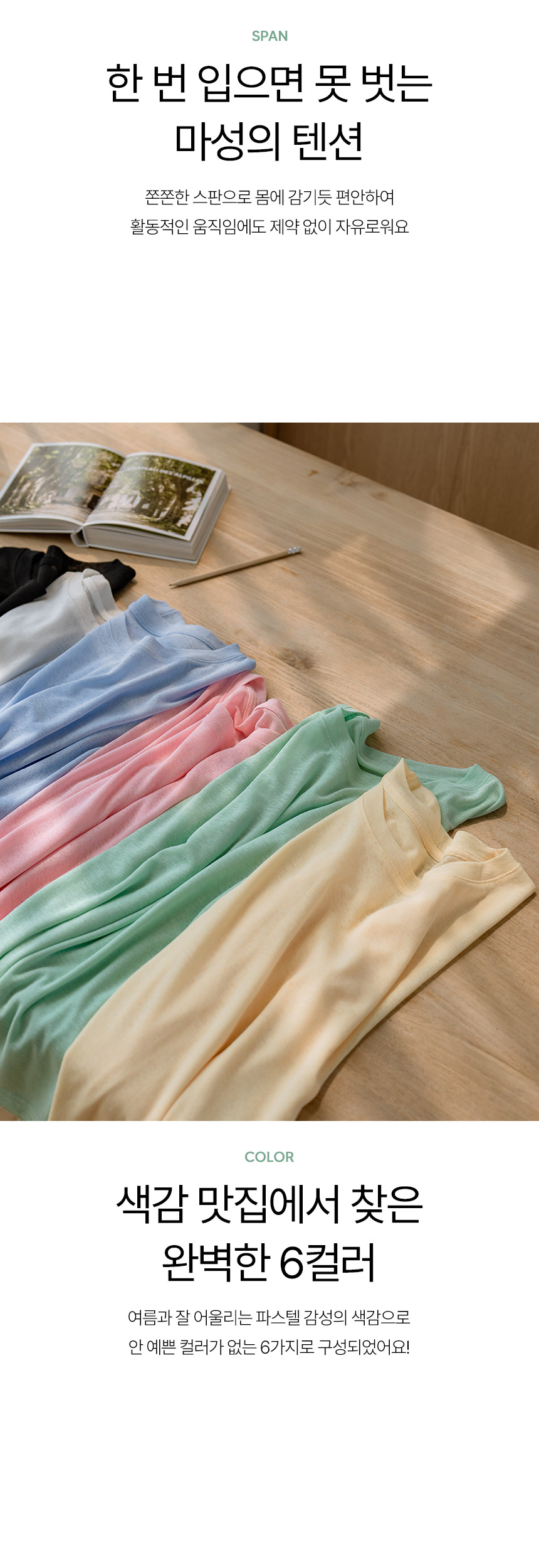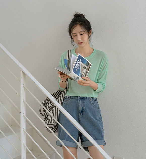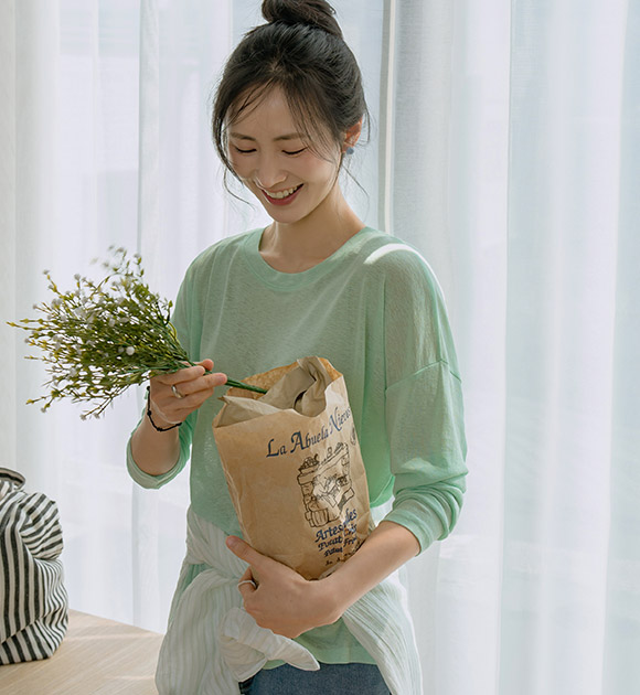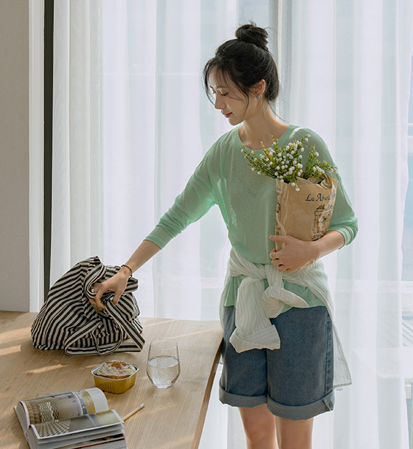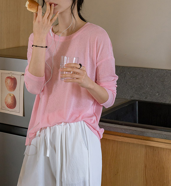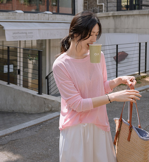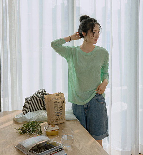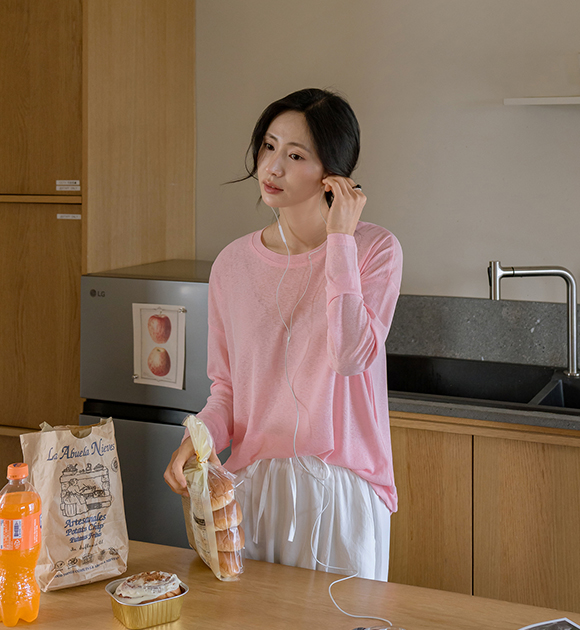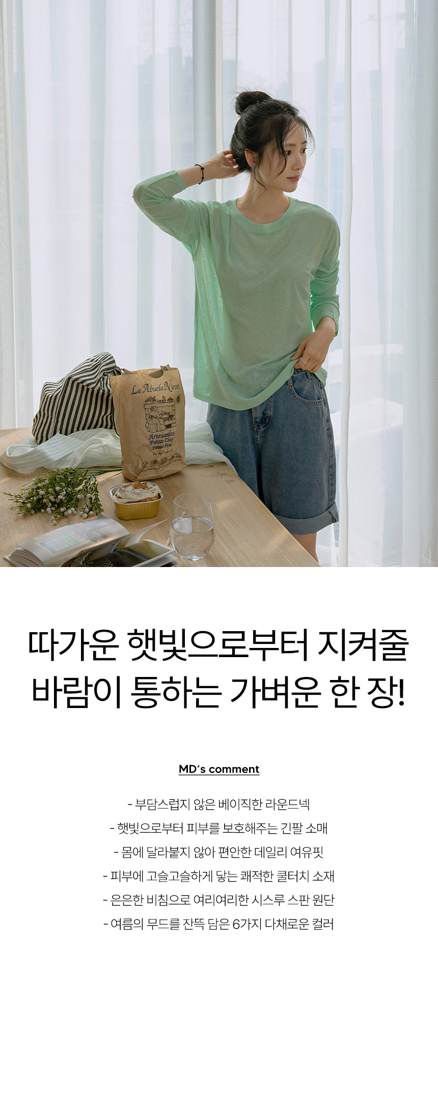햇빛으로부터 피부를 보호해주는 긴팔 티셔츠구요~ 여릿한 비침이 느껴지는 가벼운 쿨터치 소재로 한여름에도 시원하고 쾌적하게 입기 좋으며, 화사한 파스텔 톤의 색감이 피부를 환하게 밝혀줘요!