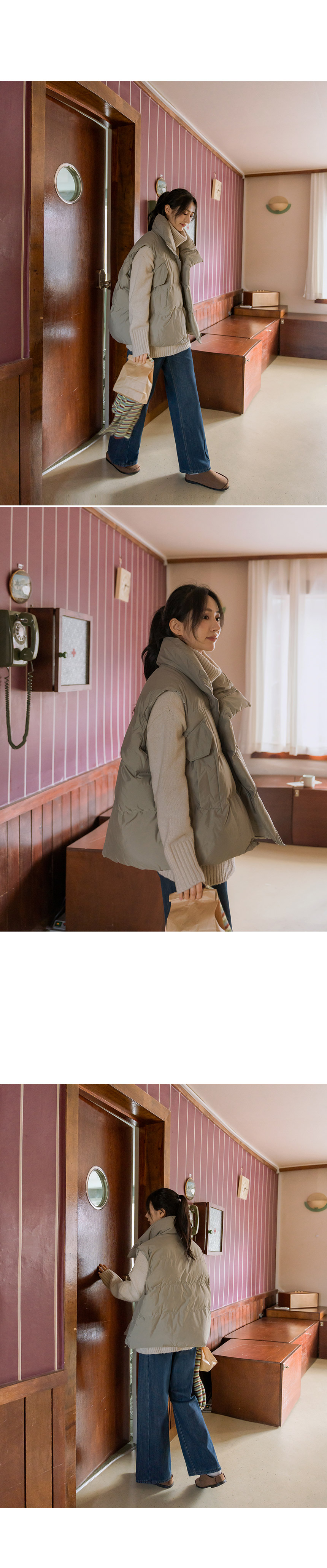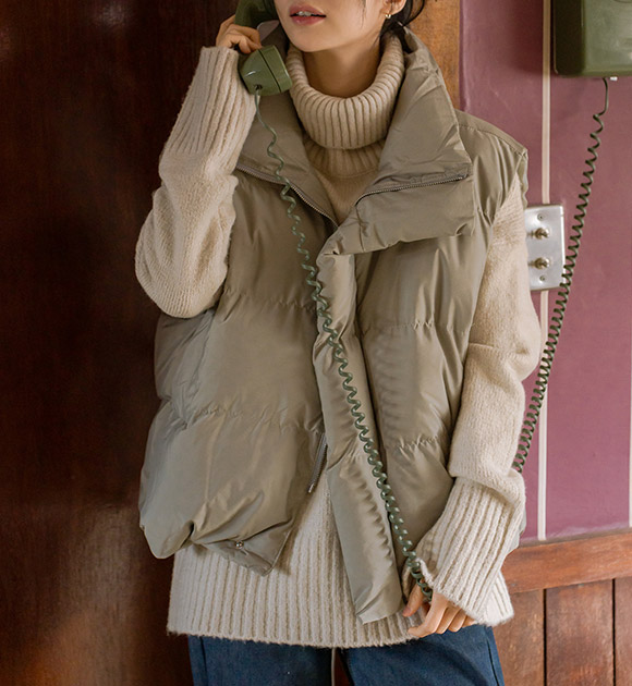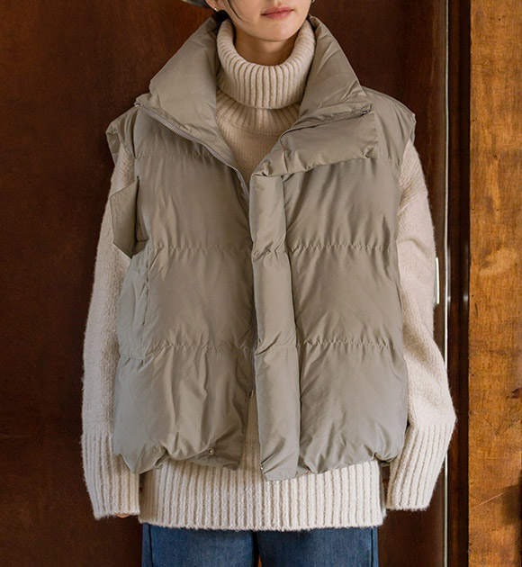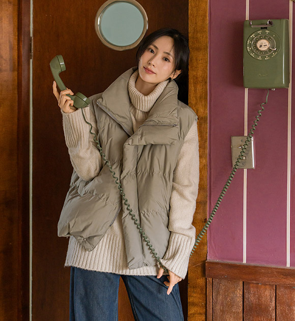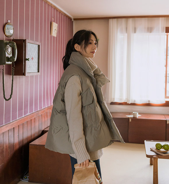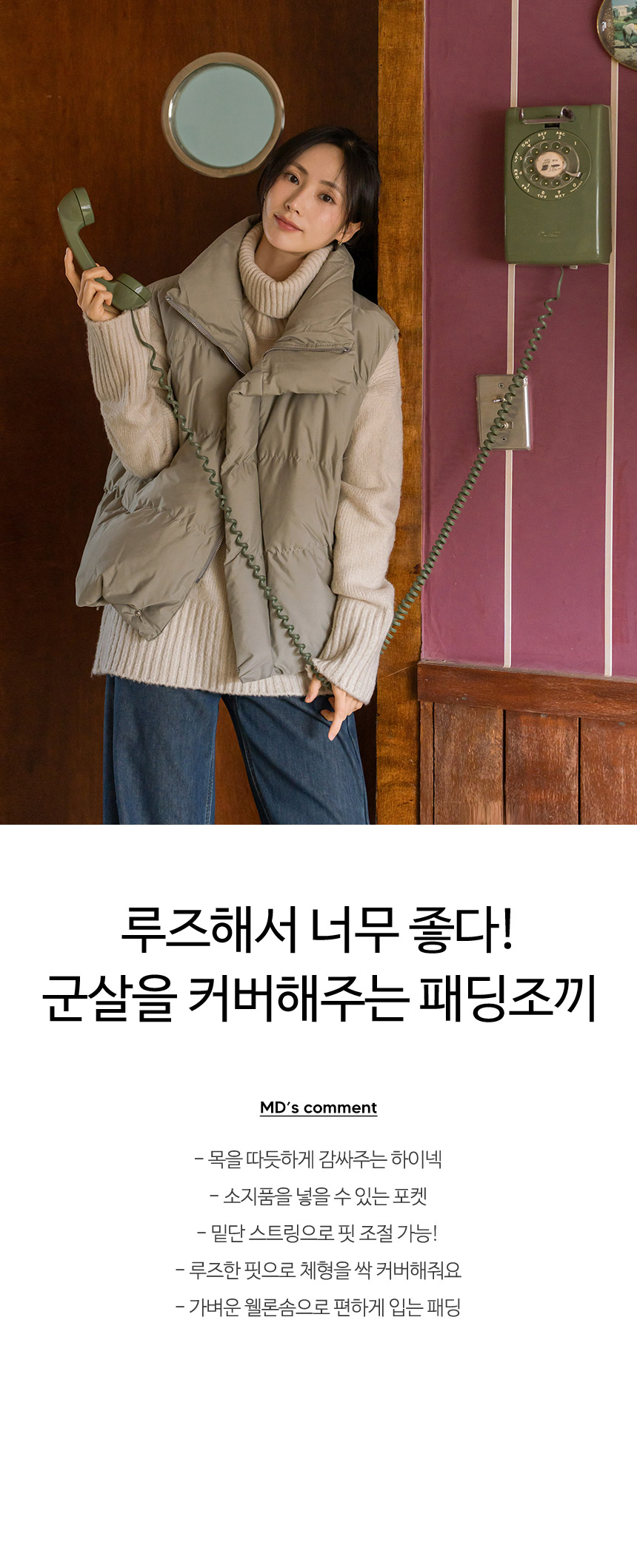 루즈한 핏으로 군살을 커버해주어 편안하게 입기 좋은 패딩조끼구요 가벼우면서 포근한 터치로 이지하게 착용 가능한 아이템이에요