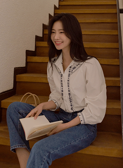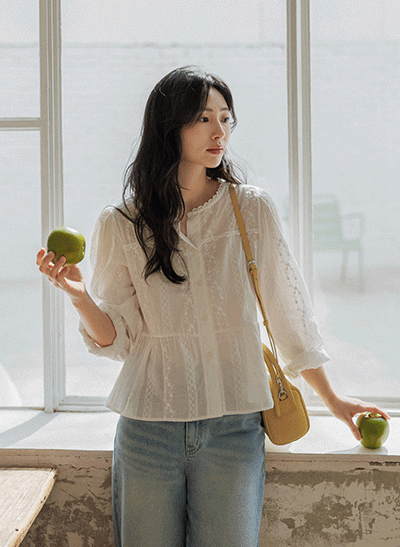 가벼운 면 원단에 작은 플로럴 자수가 섬세하게 수놓아져 러블리한 무드를 자아내는 블라우스구요~ 허리 아래로 자연스럽게 퍼지는 페플럼 디자인으로 뱃살을 커버해주면서 여성스러운 라인을 만들어줘요! -