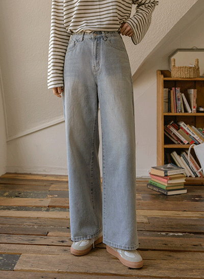 빈티지한 색감에 빠진 편안한 스판 데님이에요~ 군살 부각이 없도록 여유있게 일자로 똑- 떨어지는 와이드 핏으로 부담 없이 데일리하게 입기 좋아요! -
