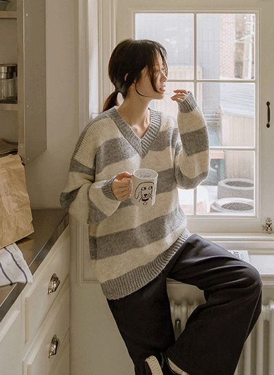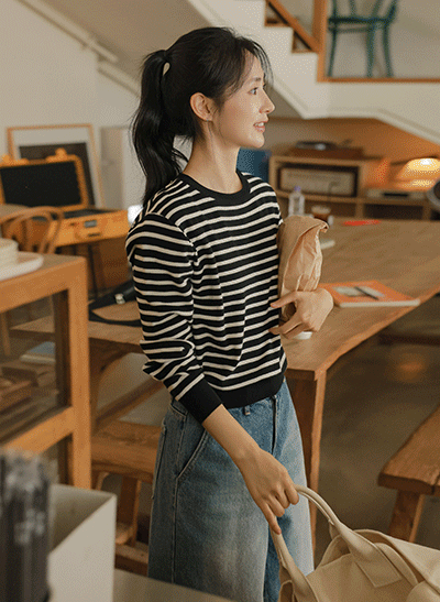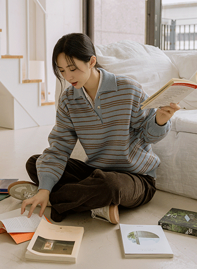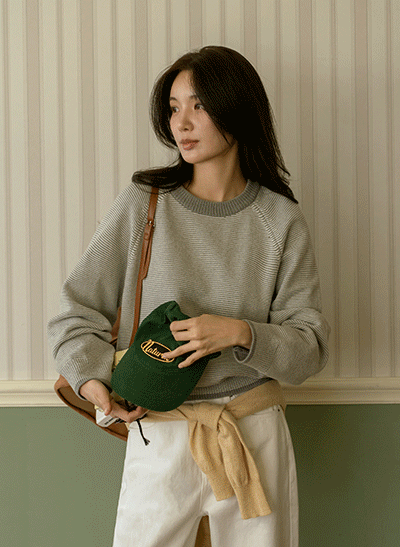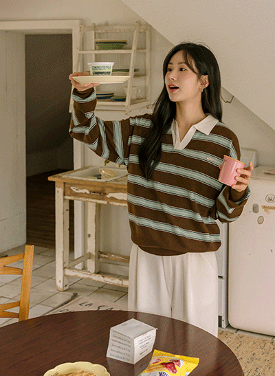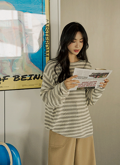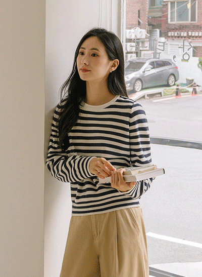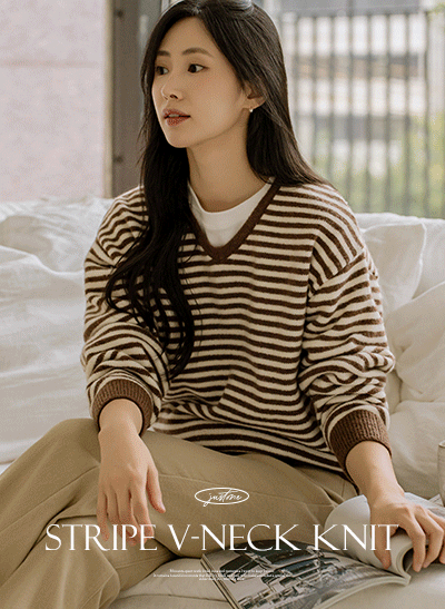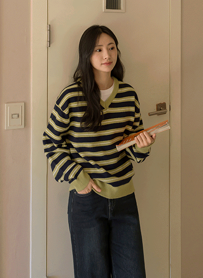 캐주얼하면서 어려 보이는 1:1 스트라이프 패턴으로 이지하게 입기 좋구요, 넥라인이 예뻐 보이는 브이넥으로 여리여리한 무드를 자아내는 아이템이에요 -
